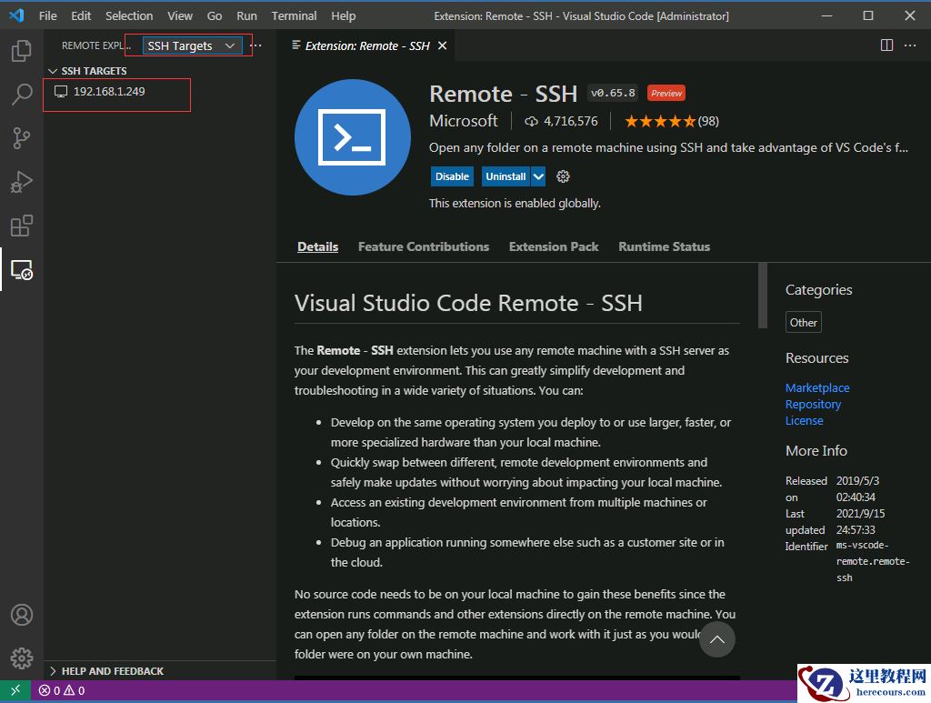 这里介绍如何使用windows上的 vscode远程访问Linux的mysql源码来执行远程调试MySQL1.在本地windows安装openssh下载安装包OpenSSH-Win64.zip并解压进行解压后的目录F:\OpenSSH-Win64\OpenSSH在cmd命令窗口中执行下面命令进行安装powershell.exe -ExecutionPolicy Bypass -File install-sshd.ps1开放22号端口(如果你在windows关闭了防火墙并配置了入站规则可以不执行如下命令,多执行不影响)netsh advfirewall firewall add rule name=sshd dir=in action=allow protocol=TCP localport=22配置开机自启sshd服务sc config sshd start= auto将F:\OpenSSH-Win64\OpenSSH添加到环境变量path中,免得每次都要切到F:\OpenSSH-Win64\OpenSSH才能使用ssh,启动ssh服务net start sshd2.1在Windows上生成密钥C:\Users\Administrator>ssh-keygen -t rsaGenerating public/private rsa key pair.Enter file in which to save the key (C:\Users\Administrator\.ssh\id_rsa):Enter passphrase (empty for no passphrase):Enter same passphrase again:Your identification has been saved in id_rsa.Your public key has been saved in id_ras.pub.The key fingerprint is:SHA256:2ya72QX0JQBxKTLM+3S1H3FFYnHHrve1t0cSbqXJiqI mysql@gbaseThe key's randomart image is:+---[RSA 2048]----+| o ooo. ++*|| = .......o+|| + ......+ || . .....oo o|| oS.. .+ B || .o . X +|| o o..o ++|| .*... .+|| E.+o. .+|+----[SHA256]-----+2.2 在Linux服务器上生成密钥[root@gbase ~]# su - mysqlLast login: Sun Sep 26 09:24:11 CST 2021 on pts/5[mysql@gbase ~]$ pwd/home/mysql[mysql@gbase ~]$ ls -lrttotal 0drwxrwxr-x. 2 mysql mysql 6 Sep 24 16:19 perl5[mysql@gbase ~]$ cd ~/.ssh-bash: cd: /home/mysql/.ssh: No such file or directory[mysql@gbase ~]$ mkdir ~/.ssh[mysql@gbase ~]$ cd ~/.ssh[mysql@gbase .ssh]$ pwd/home/mysql/.ssh[mysql@gbase .ssh]$ ls -lrttotal 0增加root权限:visudo 进入文本后找到root ALL=(ALL) ALL,另起一行,加入admin ALL=(ALL) NOPASSWD:ALL su admin 切换到新用户 再使用sudo su -切换回root,说明权限正常,进行下一步[root@gbase ~]# visudo## Allow root to run any commands anywhereroot ALL=(ALL) ALLmysql ALL=(ALL) NOPASSWD:ALL[mysql@gbase ~]$ sudo su -Last login: Sun Sep 26 11:41:38 CST 2021 on pts/1[root@gbase ~]# su - mysqlLast login: Sun Sep 26 14:20:50 CST 2021 from 192.168.1.12 on pts/3[mysql@gbase ~]$2.3将windows中生成的公钥上传到/home/mysql/.ssh/目录C:\Users\Administrator>scp C:\Users\Administrator\.ssh\id_rsa.pud mysql@192.168.1.249:/home/mysql/.ssh/authorized_keys[mysql@gbase ~]$ chmod 700 /home/mysql/.ssh[mysql@gbase ~]$ chmod 600 /home/mysql/.ssh/authorized_keys2.4切换到root,关闭root登录 sudo su - vim /etc/ssh/sshd_config 找到#PermitRootLogin yes去掉#把yes改为no systemctl restart sshd 重启服务并生效[root@gbase .ssh]# vim /etc/ssh/sshd_config# $OpenBSD: sshd_config,v 1.100 2016/08/15 12:32:04 naddy Exp $# This is the sshd server system-wide configuration file. See# sshd_config(5) for more information.# This sshd was compiled with PATH=/usr/local/bin:/usr/bin# The strategy used for options in the default sshd_config shipped with# OpenSSH is to specify options with their default value where# possible, but leave them commented. Uncommented options override the# default value.# If you want to change the port on a SELinux system, you have to tell# SELinux about this change.# semanage port -a -t ssh_port_t -p tcp #PORTNUMBER#Port 22#AddressFamily any#ListenAddress 0.0.0.0#ListenAddress ::HostKey /etc/ssh/ssh_host_rsa_key#HostKey /etc/ssh/ssh_host_dsa_keyHostKey /etc/ssh/ssh_host_ecdsa_keyHostKey /etc/ssh/ssh_host_ed25519_key# Ciphers and keying#RekeyLimit default none# Logging#SyslogFacility AUTHSyslogFacility AUTHPRIV#LogLevel INFO# Authentication:#LoginGraceTime 2mPermitRootLogin no #改成no#StrictModes yes#MaxAuthTries 6#MaxSessions 10RSAAuthentication yes #要开启PubkeyAuthentication yes #要开启# The default is to check both .ssh/authorized_keys and .ssh/authorized_keys2# but this is overridden so installations will only check .ssh/authorized_keysAuthorizedKeysFile .ssh/authorized_keys[root@gbase ~]# service sshd restartRedirecting to /bin/systemctl restart sshd.service在windows中测试ssh登录C:\Users\Administrator>ssh mysql@192.168.1.249Last login: Sun Sep 26 14:22:54 2021]ysql@gbase:~[mysql@gbase ~]$ pwd/home/mysql给vscode安装remote-development插件