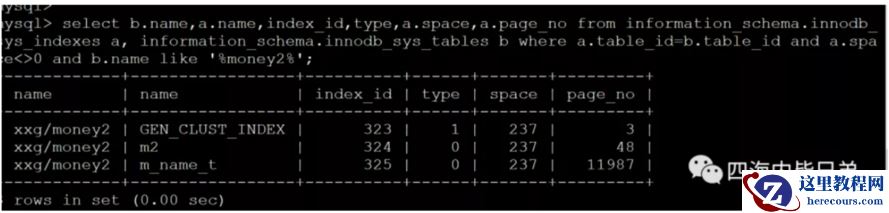 select b.name,a.name,index_id,type,a.space,a.page_no from information_schema.innodb_sys_indexes a, information_schema.innodb_sys_tables b where a.table_id=b.table_id and a.space<>0 and b.name like '%money2%';