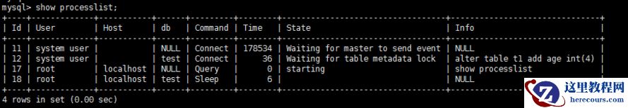 查看备库状态,在生产上一般会话会非常多,此处的12线程是从库的sql_thread ,处于waiting for table metadata lock: