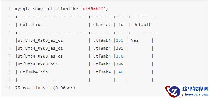 字符除了需要存储,还需要排序或比较大小,涉及与字符集相对应的校对规则。在MySQL8.0中查看一下utf8mb4对应的校对规则: