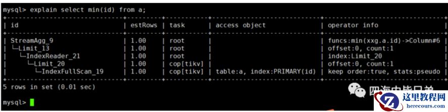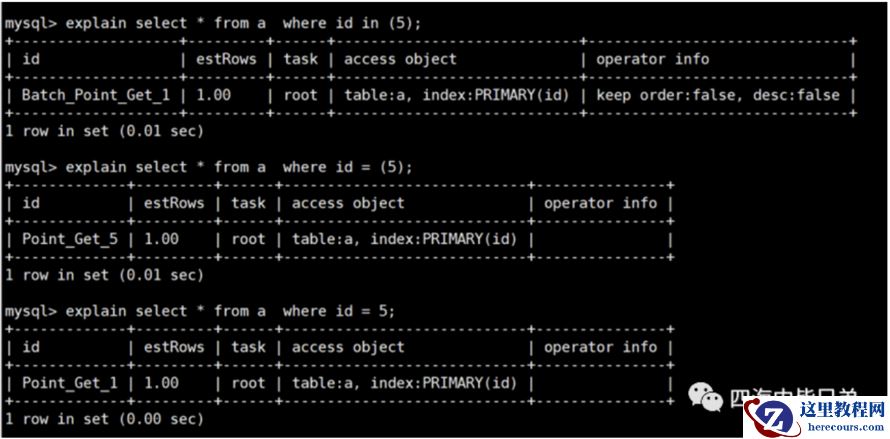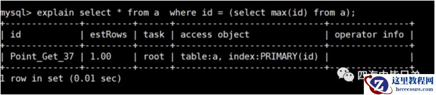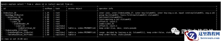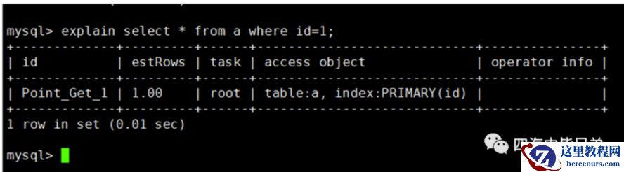 下面看TiDB的执行计划。由于直接查主键索引,执行计划也是估算一行。可以看出两个执行计划的风格,排版也不一样。