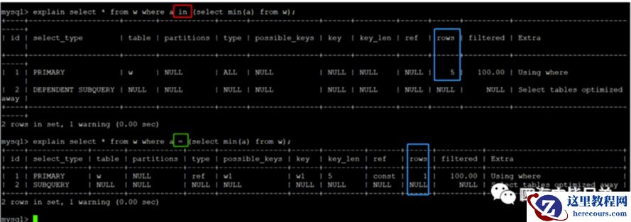 这两句的执行计划天差地别。使用in的时候子查询全表查询。而=的时候子查询极值,父查询用到了索引。这里说一下当年就是因为这个导致了当时的故障。因为在Oracle中无论哪种写法执行计划都是一模一样的。而开发同学一般不知道这些细节。认为在Oracle中可以这样用,那么在MySQL中也一样可以这样用。实际上不是这样的。
