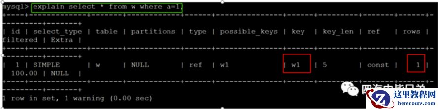 环境准备完毕。我们先看看在MySQL中查询主键的执行计划,可以看到下图红框,他用到了主键。由于a列有索引,所以用到了w1索引。
