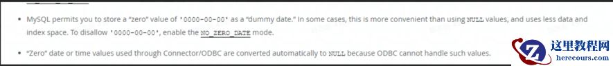 大意是,对于日期类型,MySQL会把0000-00-00,当成null值处理。这么做的原因是,odbc不支持0000-00-00的日期数据。