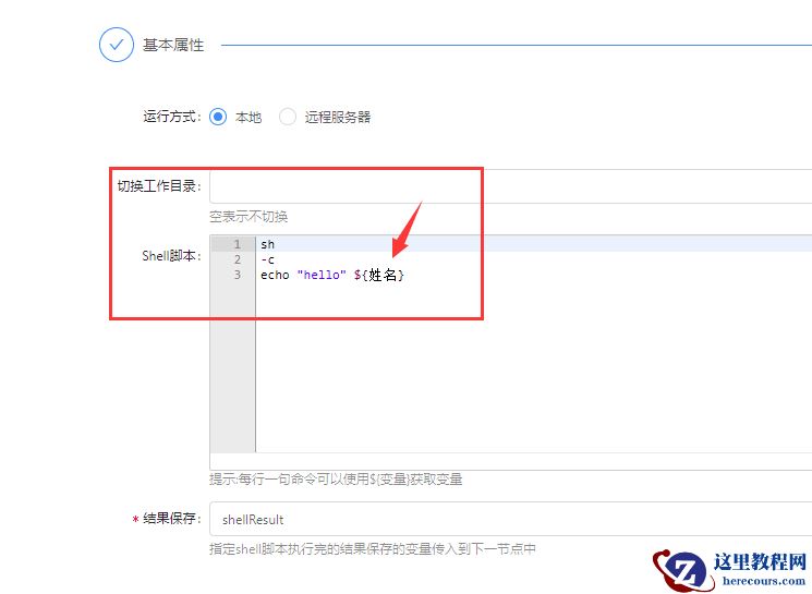 这里是shell脚本配置,写个简单的脚本,使用${变量id}调用上个节点传入的变量数据。