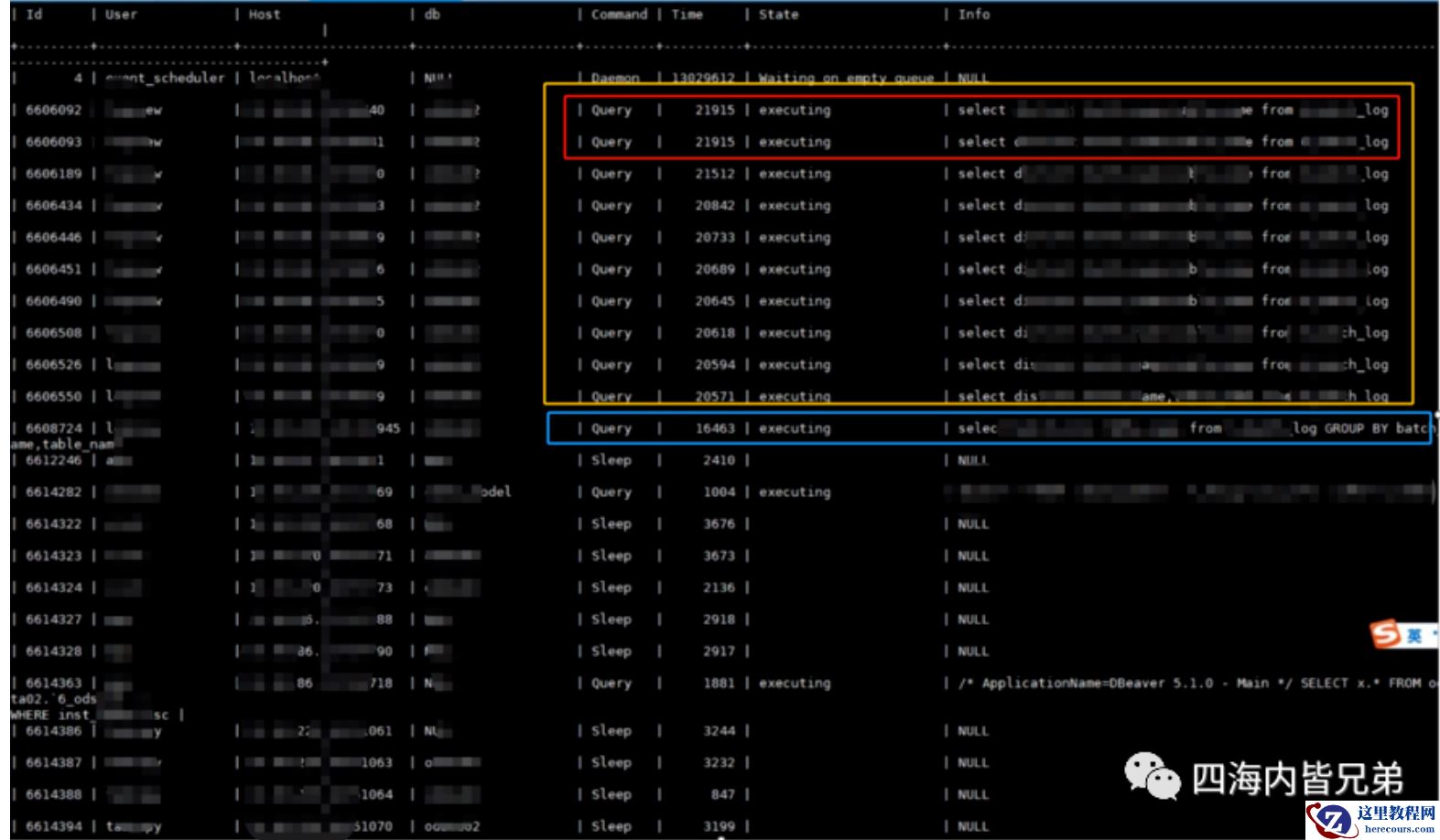 看到红黄框一共10句,是一模一样的SQL,对一个log表全表排序。其中红框的两句几乎是同一时刻。后面的估计是执行了没反应继续点击。而蓝框中的SQL是对这个log表全表分组,其实性质一样。