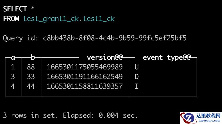 这里可以明显看到,test_grant1_ck.test1_ck中记录的是源库做的所有DML操作,通过视图合并后,test_grant1.test1查询