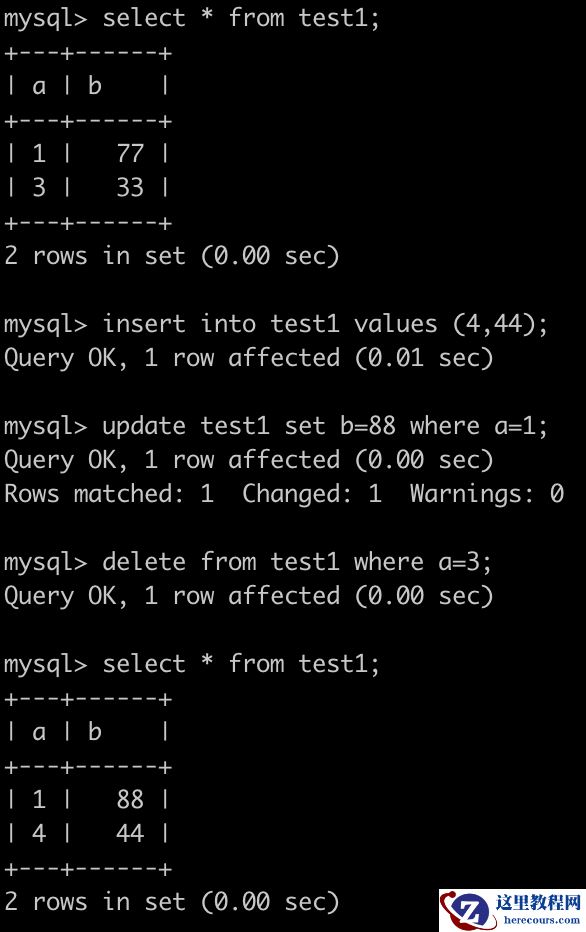 mysql> insert into test1 values (1,11),(2,22),(3,33); mysql> update test1 set b=77 where a=1; mysql> delete from test1 where a=2; ck> select * from db1_ck.test1; ┌─a─┬──b─┐ │ 1 │ 77 │ │ 3 │ 33 │ └───┴────┘