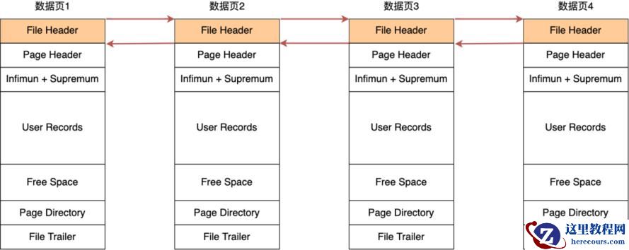 在 File Header 中有两个指针,分别指向上一个数据页和下一个数据页,连接起来的页相当于一个双向的链表,如下图所示: