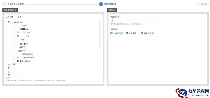 输入源端目标端的数据库信息后 , 测试连接通过后 , 就进入了迁移选项页面 。 页面中可以选择需要迁移的用户和 DB , 还可以指定并发数 、 迁移结构 、 数据及是否同步增量数据 。