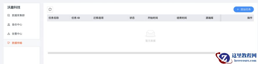 点击免费使用后进入到了 DBMotion 的控制台 , 页面比较简洁 , 数据传输里面就一个添加任务的按钮 , 点一下试试 。