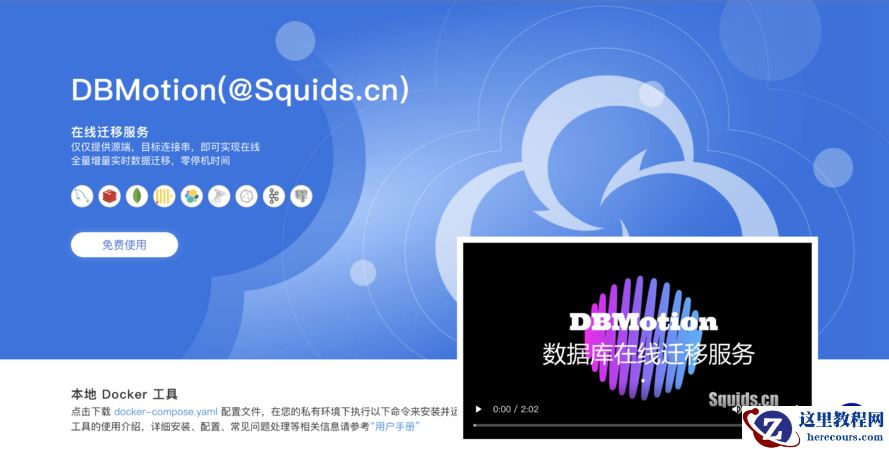 DBMotion 主页中有演示视频 , 对 DBMotion 做了一些介绍 。 使用的话 , 可以本地利用 docker 搭建 , 或者点击免费试用直接适用在线环境 。 在这里 , 点击免费使用 , 用一下在线环境 。