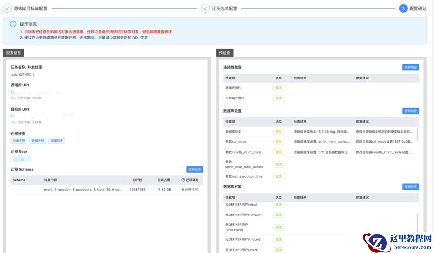 这里选了一个测试的 DB , 包含 10 张 500 W 的表及测试用户 。 做一下全量 + 增量的迁移 , 点击下一步就进入了预检查的页面 。 预检查页面会有迁移的内容 , 迁移的数据量大小及耗时评估 。 11 G 预估 5 分钟迁移完 , 每秒大概 30 多 M , 速度还不错 。 不过这应该是指最大速度 , 我两个环境之间的带宽是 40 M 的 , 能达到 5 M / s 就不错了 , 这里预估的时候应该没考虑到带宽 。 另外 , 还有一些影响迁移及迁移后使用的一些检查 , 并会给出修复建议 , 省了自行检查的功夫 。 细看了下预检查的项 , 还有 binlog 保留时间以及 procedure 等对象的定义者检查 。 之前踩过这方面的坑 , 感觉预检查的内容还是挺全面的 。
