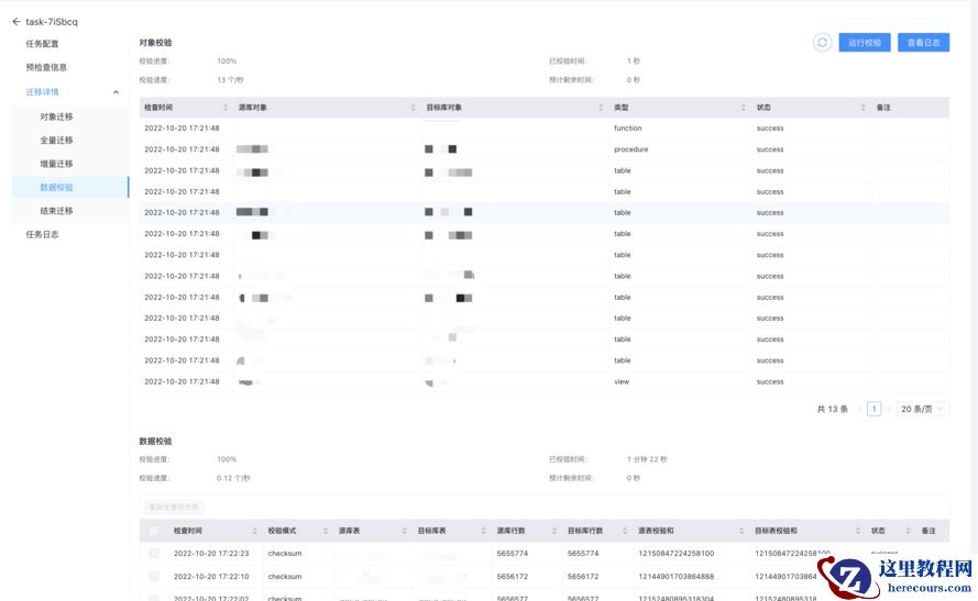 然后再看一下数据校验 。 咨询了下官方客服 , 校验的时候要停业校验 , 看来没有做成 pt - table - checksum 那种在线的方式 , 不过也能接受 。 停止测试增量数据的压测 , 点击一下运行校验 , 可以看到校验了各种对象结构以及数据 , 数据采用了行数和 checksum 的双重校验方式 。