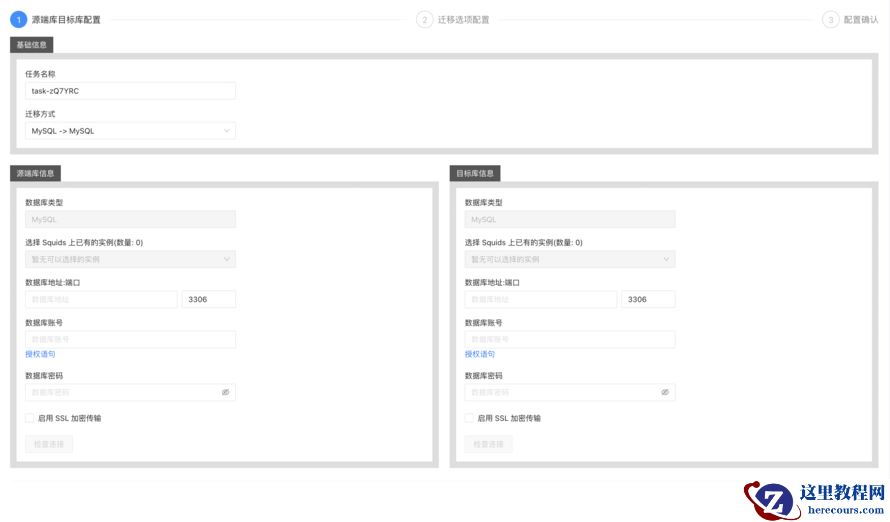 点击添加任务后 , 看到了熟悉的界面 。 无非是输入源端目标端的的数据库 IP 、 端口 、 账号 、 密码 , 另外给了迁移所需要的最小权限的授权语句 . 由于我对账号没做什么限制 , 就直接用 root 账号了 。 迁移方式这里还提供了三种迁移方式 , 分别是 M y SQL to M y SQL 、 M y SQL to C lick H ouse , M ongo to M ongo , 这里主要关注 M y SQL to M y SQL 。