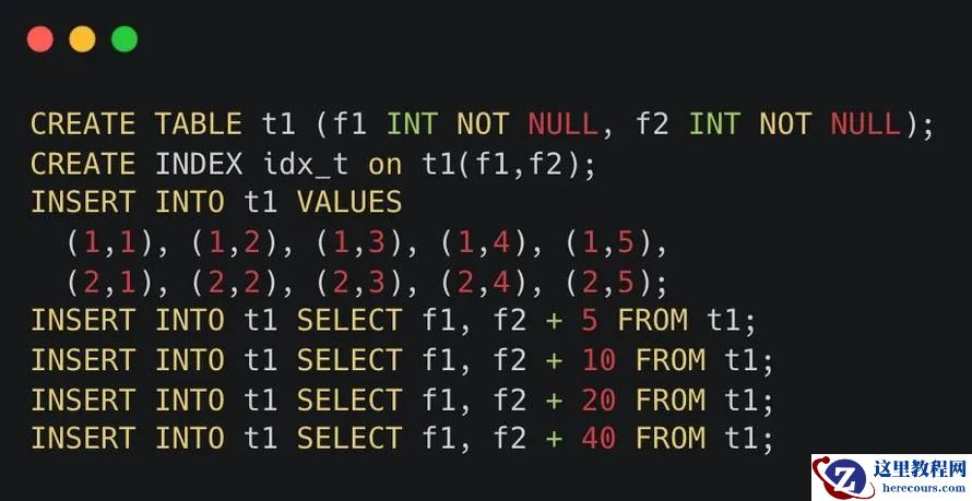 通过上面的SQL,先创建一张t1表,并把f1,f2两个字段设置为联合索引。之后再向其中插入一些记录。