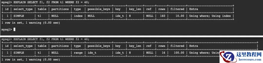 从rows上也能看得出来,使用index的扫描方式共扫描了160行,而使用range的扫描方式只扫描了16行。