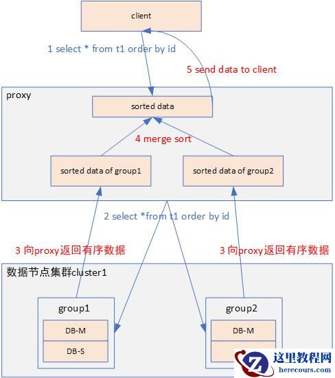 2)proxy根据分片键向相关的数据分片group1、group2下发排序查询语句select *from t1 order by id。
