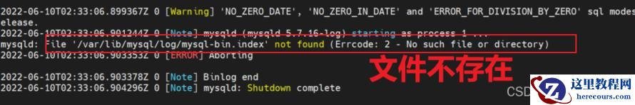 ⑨ 报错信息是提示缺少 mysql-bin.index,那我们就去检查下呗,确实没有啊!先不管这个文件怎么消失的吧,赶紧把这个 log 文件夹先创建出来,然后 mysql 会自动给我们生成这个文件的。