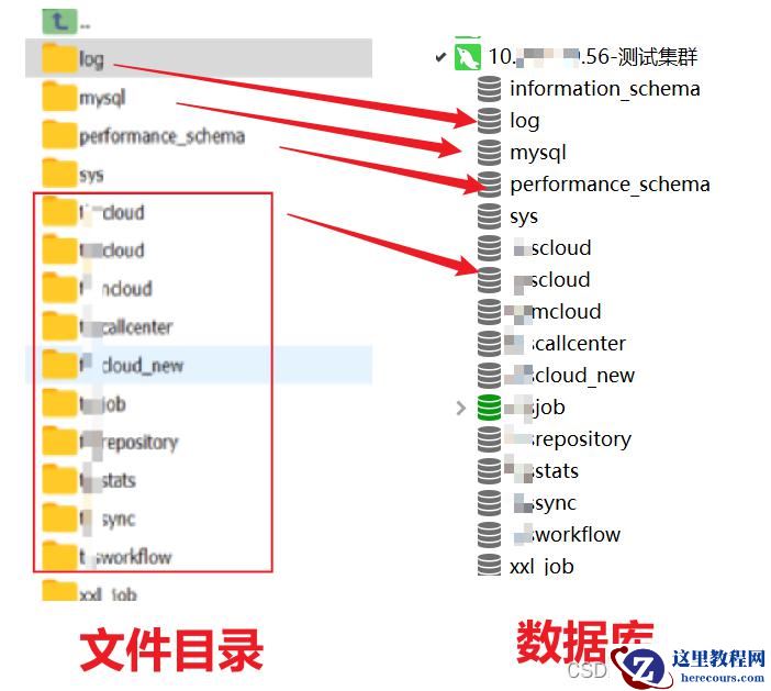但是发现 log 的上级目录 /var/lib/mysql 有很多其他文件夹,比如 xxcloud, xxcenter 等。这不就是我们项目中几个数据库的名字么,只要在这个目录的文件夹,都会显示在 navicat 上,是一一对应的,如下图所示。其中也显示了 log 数据库。