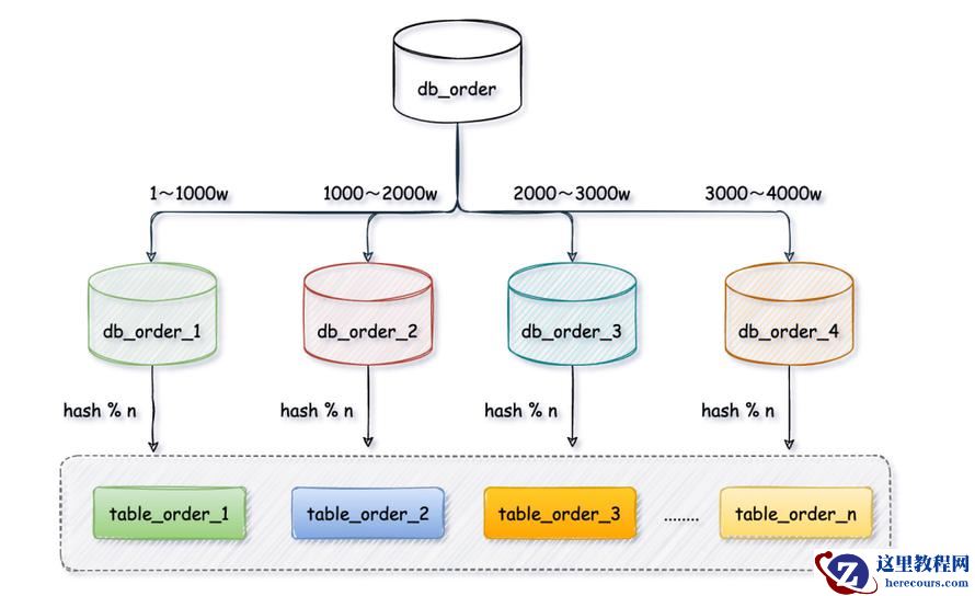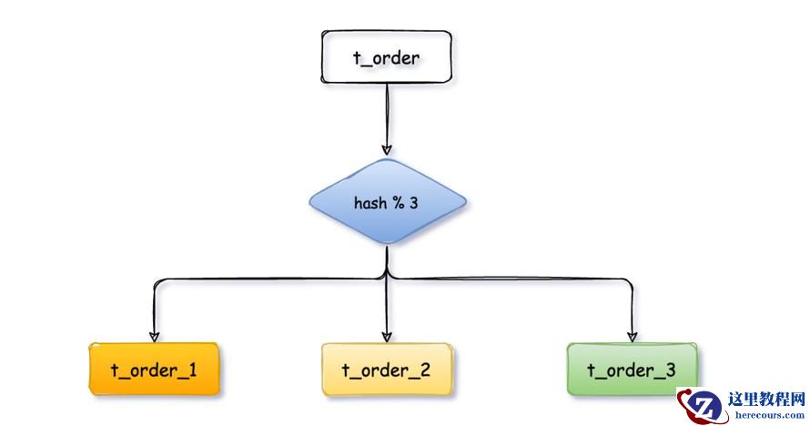 以t_order订单表为例,先给数据库从 0 到 N-1进行编号,对 t_order订单表中order_no订单编号字段进行取模hash(order_no) mod N,得到余数i。i=0存第一个库,i=1存第二个库,i=2存第三个库,以此类推。