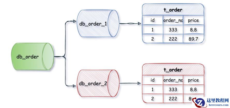 例如:db_orde_1、db_order_2两个数据库内有完全相同的t_order表,我们在访问某一笔订单时可以通过对订单的订单编号取模的方式 订单编号 mod 2 (数据库实例数) ,指定该订单应该在哪个数据库中操作。