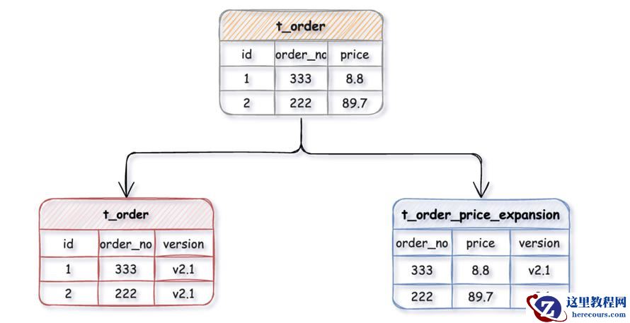 例如:一张t_order订单表上有几十个字段,其中订单金额相关字段计算频繁,为了不影响订单表t_order的性能,就可以把订单金额相关字段拆出来单独维护一个t_order_price_expansion扩展表,这样每张表只存储原表的一部分字段,通过订单号order_no做关联,再将拆分出来的表路由到不同的库中。