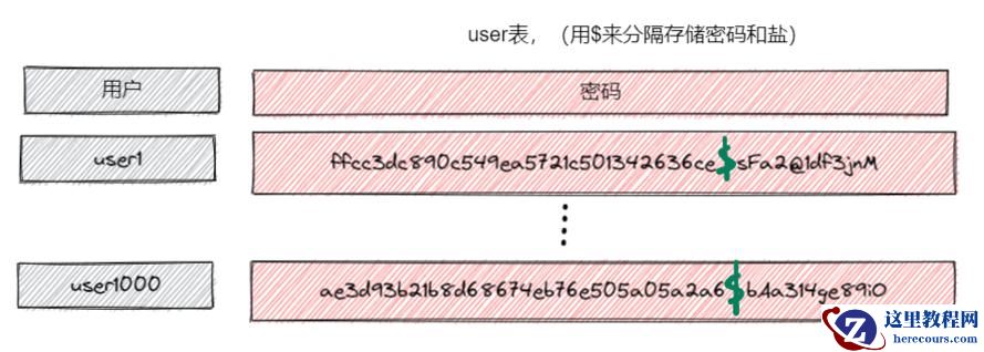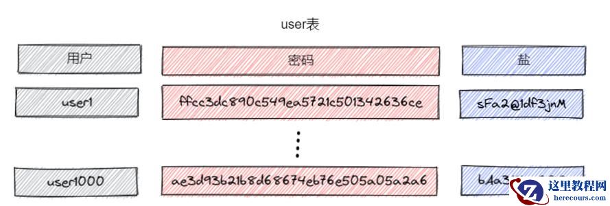 动态盐需要分别为每个用户记录对应密码加的盐值,一般是落库存储,比如上图所示在用户表上加个 salt 字段。