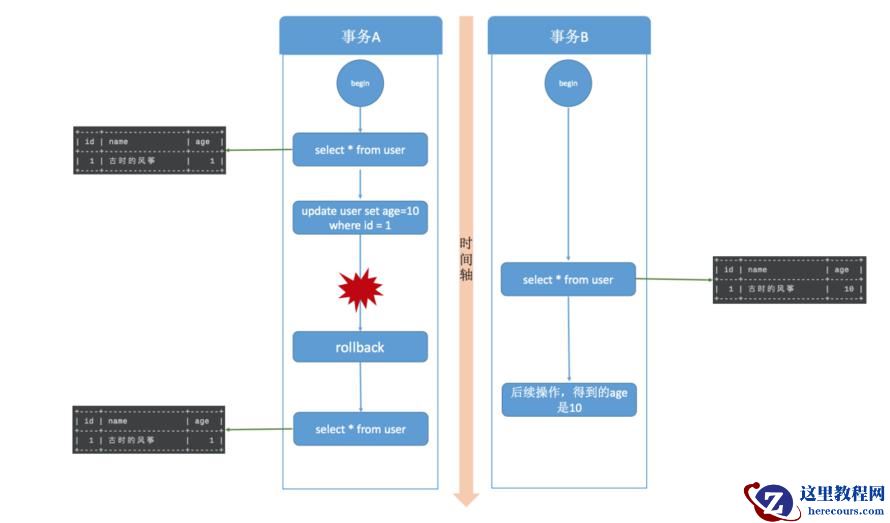 启动两个事务,分别为事务A和事务B,在事务A中使用 update 语句,修改 age 的值为10,初始是1 ,在执行完 update 语句之后,在事务B中查询 user 表,会看到 age 的值已经是 10 了,这时候事务A还没有提交,而此时事务B有可能拿着已经修改过的 age=10 去进行其他操作了。在事务B进行操作的过程中,很有可能事务A由于某些原因,进行了事务回滚操作,那其实事务B得到的就是脏数据了,拿着脏数据去进行其他的计算,那结果肯定也是有问题的。
