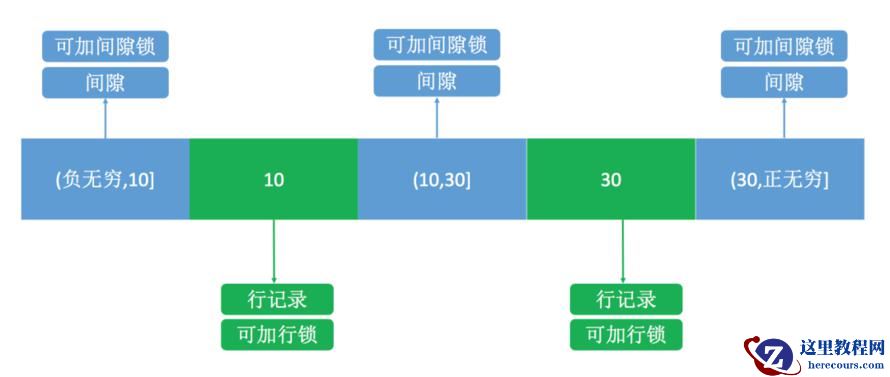 如图所示,分成了3 个区间,(负无穷,10]、(10,30]、(30,正无穷],在这3个区间是可以加间隙锁的。