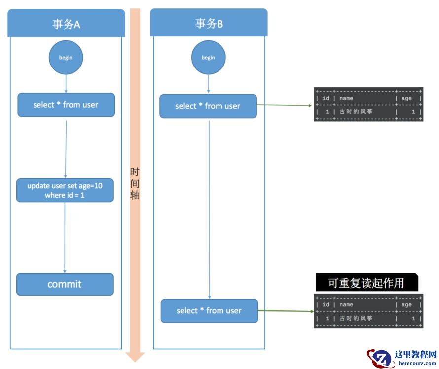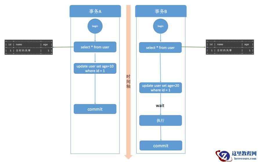 顺着时间轴往表示两事务中操作的执行顺序,重点看图中 age 字段的值。