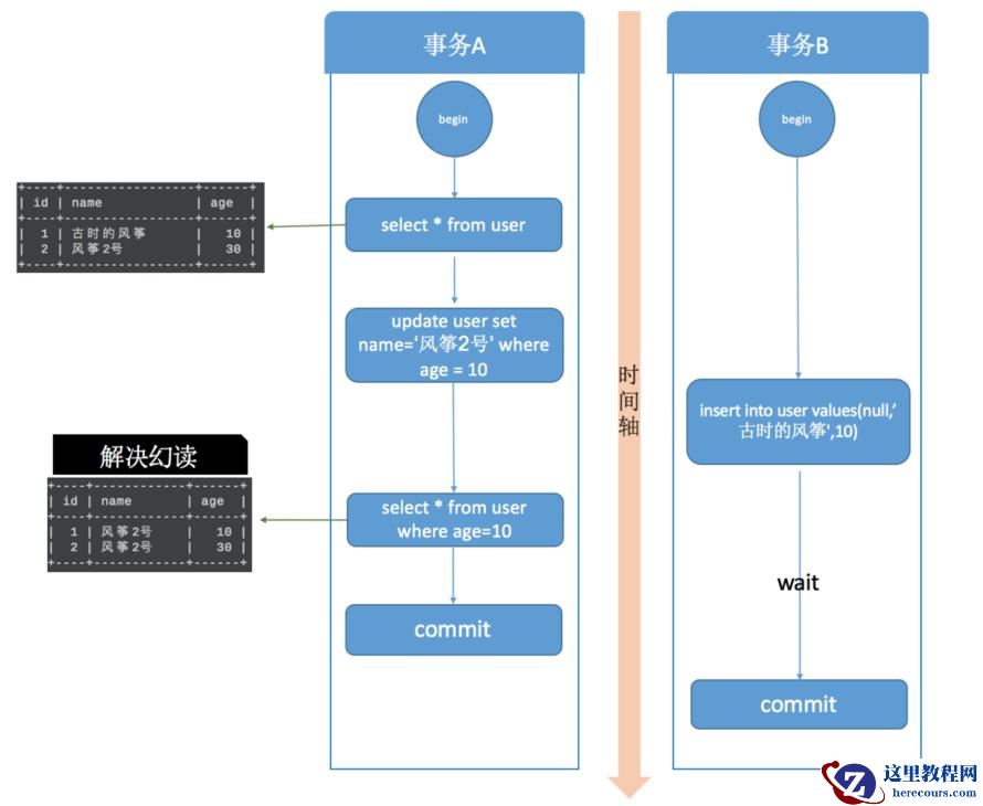 在事务A提交之前,事务B的插入操作只能等待,这就是间隙锁起得作用。当事务A执行update user set name='风筝2号’ where age = 10; 的时候,由于条件 where age = 10 ,数据库不仅在 age =10 的行上添加了行锁,而且在这条记录的两边,也就是(负无穷,10]、(10,30]这两个区间加了间隙锁,从而导致事务B插入操作无法完成,只能等待事务A提交。不仅插入 age = 10 的记录需要等待事务A提交,age<10、10<age<30 的记录页无法完成,而大于等于30的记录则不受影响,这足以解决幻读问题了。