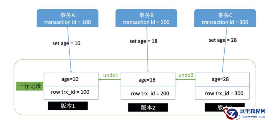 按照上面这张图理解,一行记录现在有 3 个版本,每一个版本都记录这使其产生的事务 ID,比如事务A的transaction id 是100,那么版本1的row trx_id 就是 100,同理版本2和版本3。