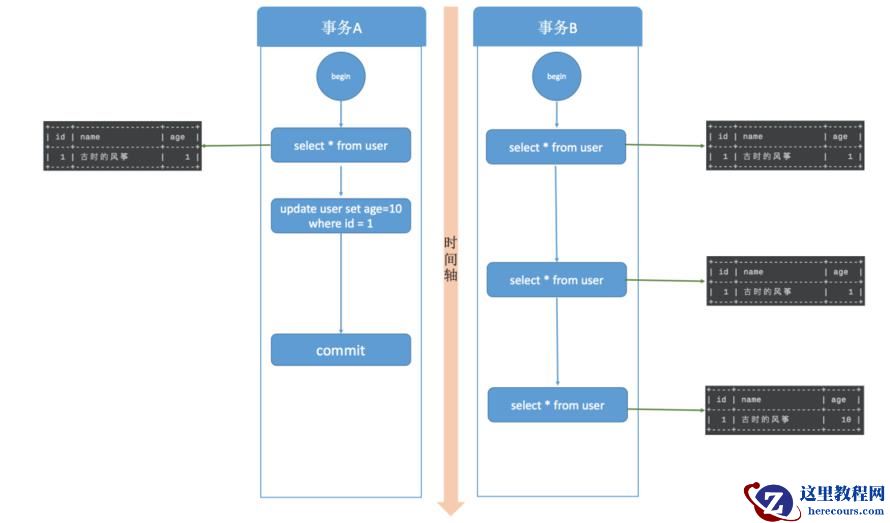 这就出现了一个问题,在同一事务中(本例中的事务B),事务的不同时刻同样的查询条件,查询出来的记录内容是不一样的,事务A的提交影响了事务B的查询结果,这就是不可重复读,也就是读提交隔离级别。