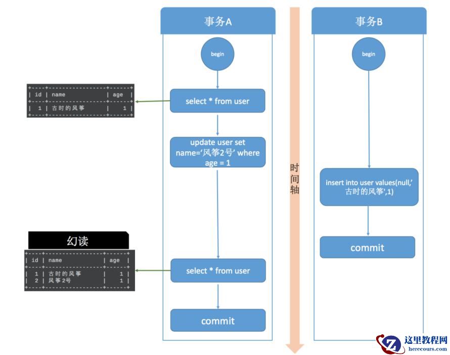 事务B提交后,事务A中执行 select,查询 age=1 的数据,这时,会发现多了一行,并且发现还有一条 name = 古时的风筝,age = 1 的记录,这其实就是事务B刚刚插入的,这就是幻读。