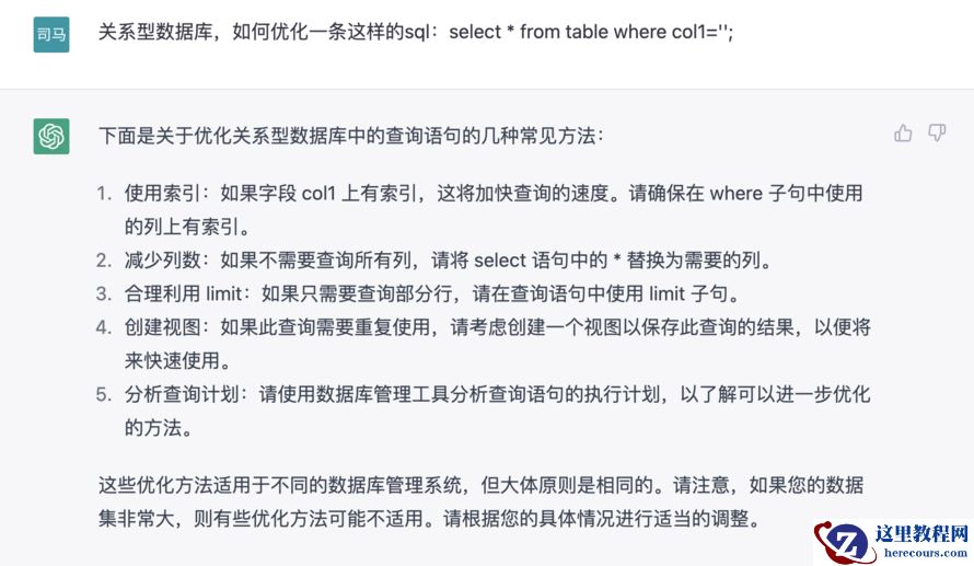 不考虑硬件、数据库架构、表设计等优化改动,单从这条 SQL上,GPT 从索引、查询列、结果集大小、缓存等方面优化的措施还是很全面和准确,并且最后还推荐用户查看 SQL语句的执行计划,可以说是提供了保姆式的 DBA 专家服务了。