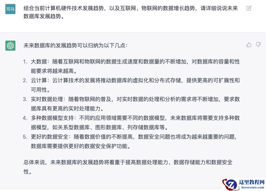 最后测试了一个更开放的问题,让GPT谈谈未来数据库发展趋势,这类问题是人人可以谈,但往往也是普通数据库使用者最欠缺的知识。GPT认为在大数据、云计算、高性能、多模和安全将是未来数据库发展的趋势,这些观点基本与业界认知一致。