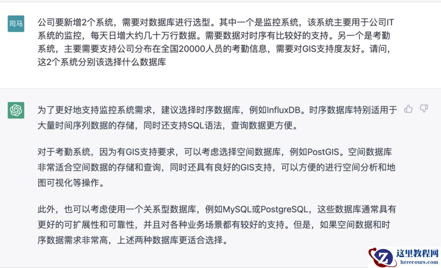 在这个案例中,特别在需求中强调了时序和GIS信息,GPT也能敏锐地捕捉到用户的意思。在提供的方案中,推荐了在时序数据库方面有优秀表现的InfluxDB,以及在GIS有良好支持的PostGIS,这两个数据库也是各自领域的领导者。如果特别注重时序和空间地理的厂家,选择这两个产品应该是最佳选择之一。