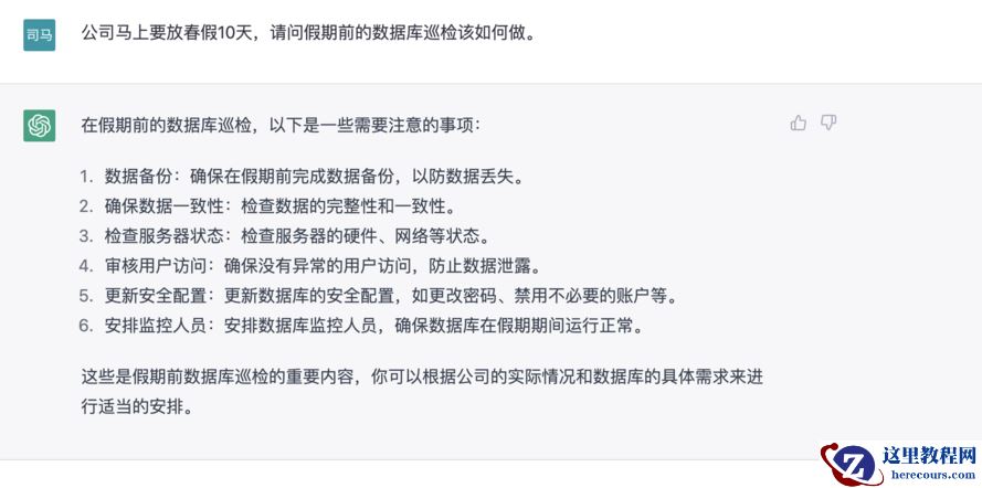 GPT对这个问题回答是比较水的,假期前的数据库巡检,一般并不关注数据备份、数据一致性、用户访问策略、安全配置等事项,反而是最后项安排值班人员是SOP。