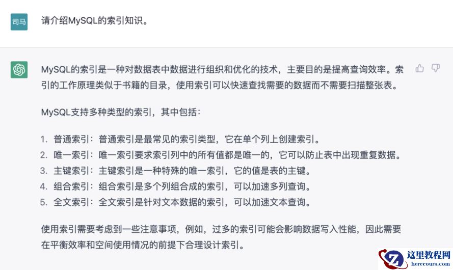 关于MySQL数据库索引知识,几乎是所有开发者和MySQL DBA求职时必问问题之一。GPT的回答虽然没有深入介绍索引的数据结构,但是这回答也不能说它是错误的,毕竟它也说了索引是牺牲空间换取效率的一种措施和过多索引的问题。