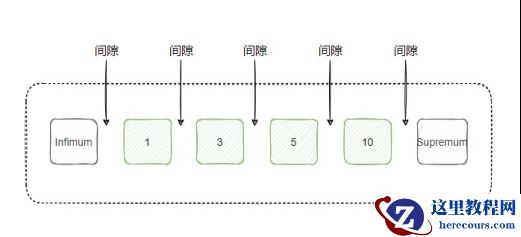 前面讲的记录锁是加到已经存在的记录上,但是如果要给此时还未存在的记录加锁怎么办?也就是要预防幻读的出现,这需要使用间隙锁。 比如此时有 1、3、5、10 这四条记录,数据页中还有两条虚拟的记录,分别是 Infimum 和 Supremum。