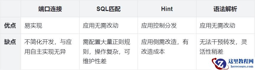 该实现方式就读写分离功能而言不是太好,因为此方式与应用自己实现没有明显差别,只是将直接连接不同数据库的逻辑变成了连接中间件服务器的不同端口,并没有对应用系统开发带来实质性的简化工作。