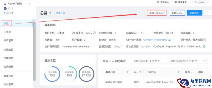 扩容资源:进入OCP -> 找到要扩容的集群 -> 总览 -> 新增OBServer;