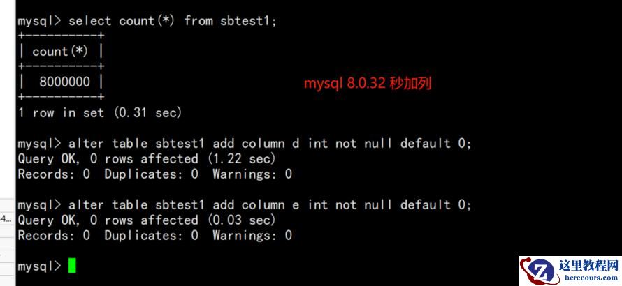 mysql> alter table sbtest1 add column e int not null default 0;