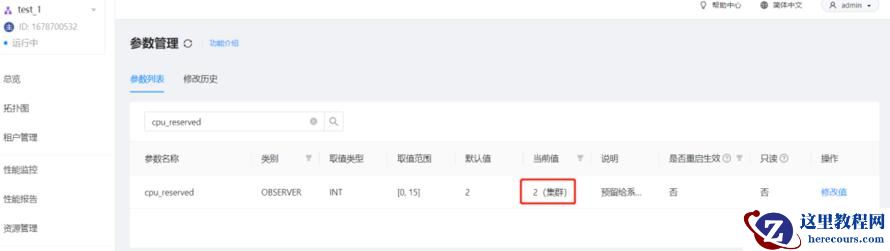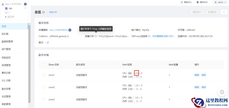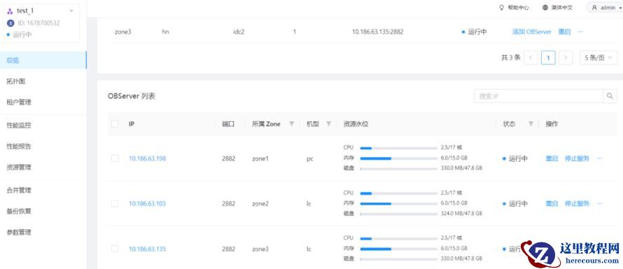 以 10.186.63.198 为例,浅看一下cpu、内存、磁盘的含义以及相关联参数2.5 代表 observer上已经分配给租户的 cpu 核数,该数值是 租户的 Min CPU17 代表当前的 observer 可用的 cpu 数,通常 observer 会预留一部分 cpu 给操作系统,由参数 cpu_reserved 进行控制验证: