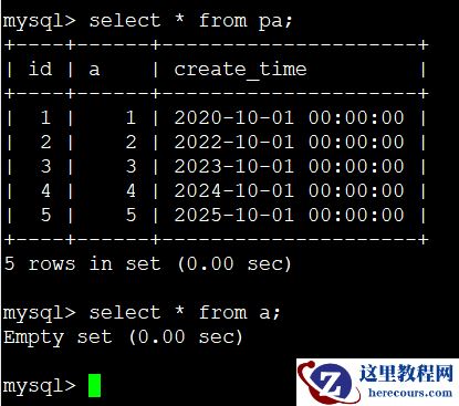 mysql> insert into pa (a,create_time) values (1,'2020-10-01'); Query OK, 1 row affected (0.01 sec) mysql> insert into pa (a,create_time) values (2,'2022-10-01'); Query OK, 1 row affected (0.00 sec) mysql> insert into pa (a,create_time) values (3,'2023-10-01'); Query OK, 1 row affected (0.00 sec) mysql> insert into pa (a,create_time) values (4,'2024-10-01'); Query OK, 1 row affected (0.00 sec) mysql> insert into pa (a,create_time) values (5,'2025-10-01'); Query OK, 1 row affected (0.00 sec)