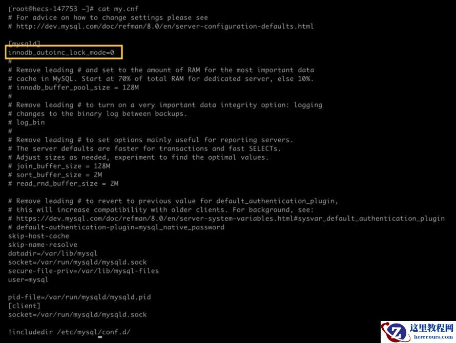 我先把它改成 0,修改方式就是在 /etc/my.cnf 文件中添加一行 innodb_autoinc_lock_mode=0: