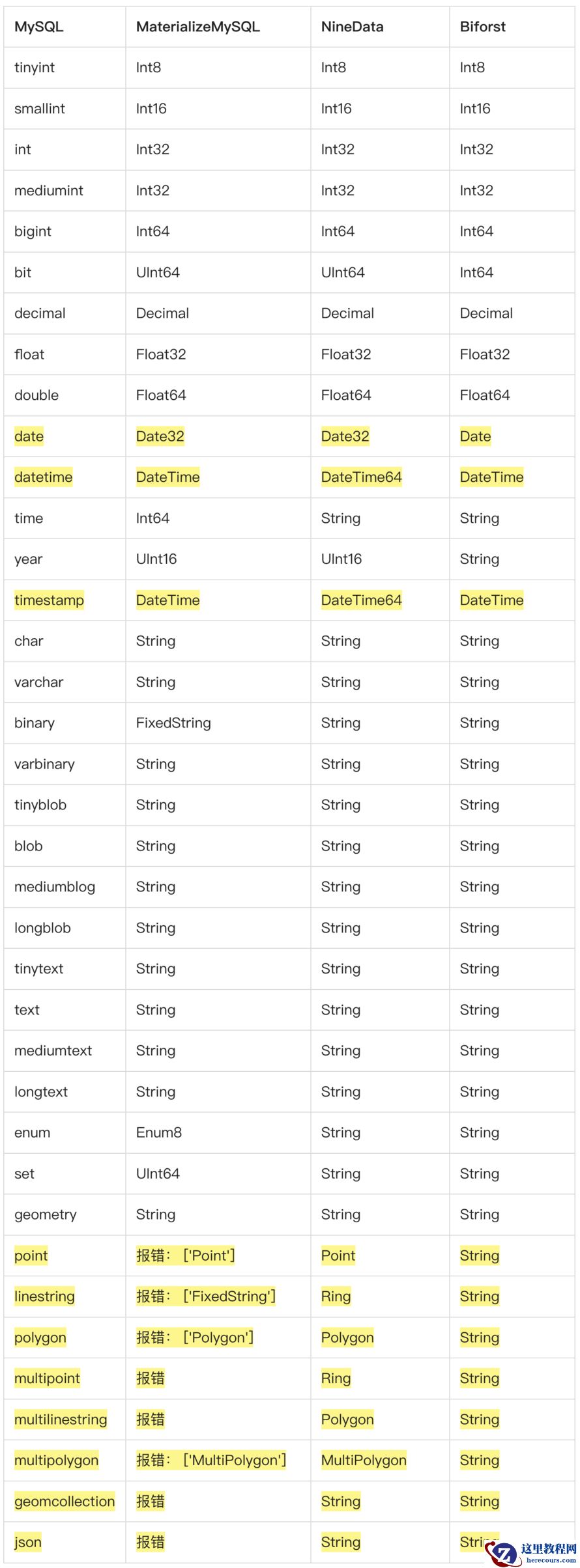 在做了详细对比之后,对于基础类型,只有NineData考虑的更加完整,例如MySQL的datetime需要映射到ClickHouse的DateTime64,否则则可能出现数据丢失。如果使用Biforst或MaterializeMySQL等其他产品均映射到datetime可能会造成一定程度的数据精度丢失。