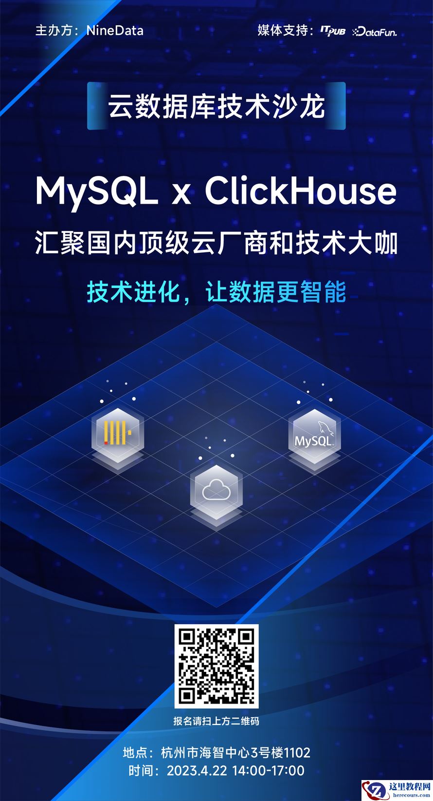 4月22日下午14:00,云数据库技术和NineData主办的「MySQL x ClickHouse」技术沙龙,将在杭州市海智中心3号楼1102报告厅举办。