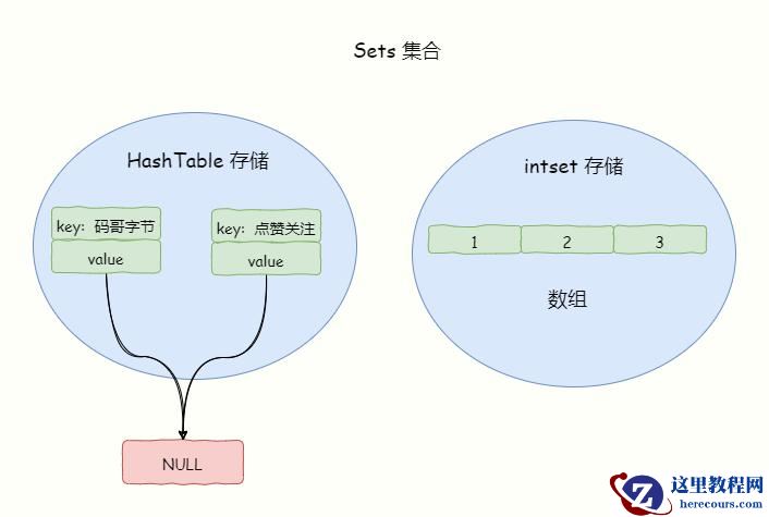 Java 的 HashSet 底层是用 HashMap 实现,Sets 的底层数据结构也是用 Hashtable(散列表)实现,散列表的 key 存的是 Sets 集合元素的 value,散列表的 value 则指向 NULL。